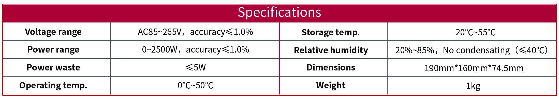 | -- | The monitoring range is 1W ~ 3000W, when it is lower than 1W, it is judged as no power, and the judging time can be set for 3 ~ 99S |