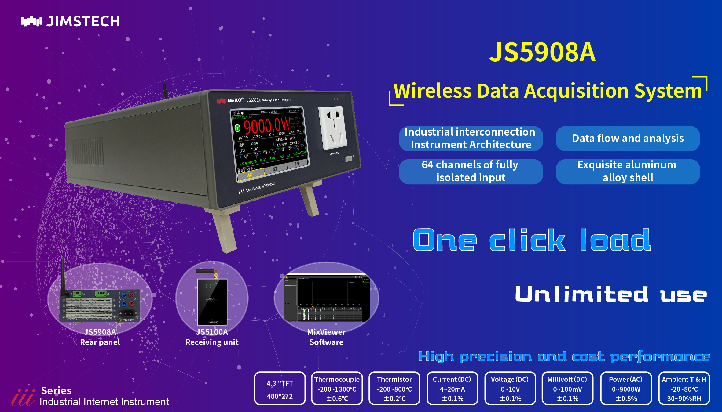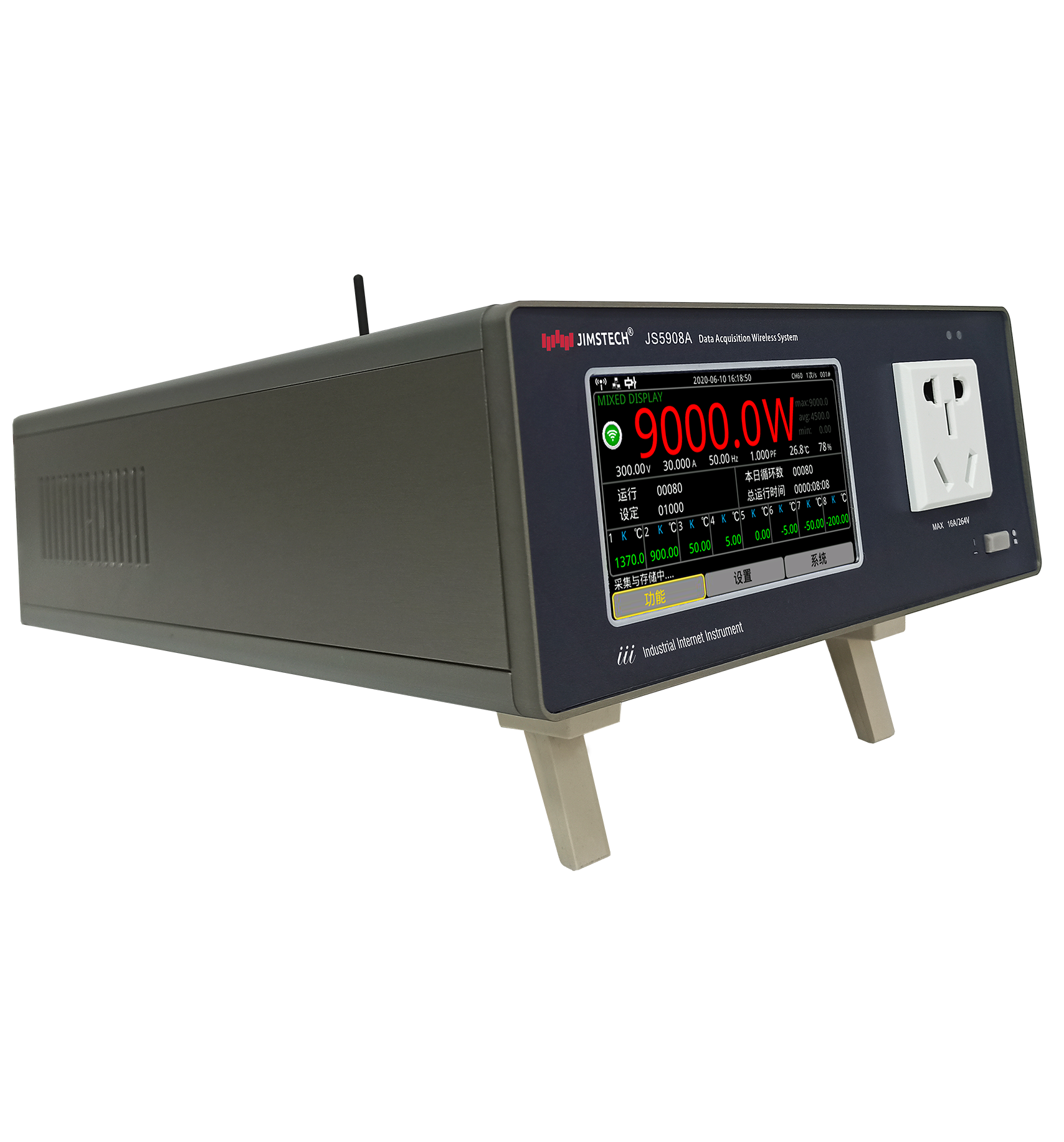 JS5908A Wireless Data Acquisition System is composed of industrial interconnection Instrument Architecture, exquisite aluminum alloy shell surface, full isolation universal input, synchronous flow and analysis of test data.